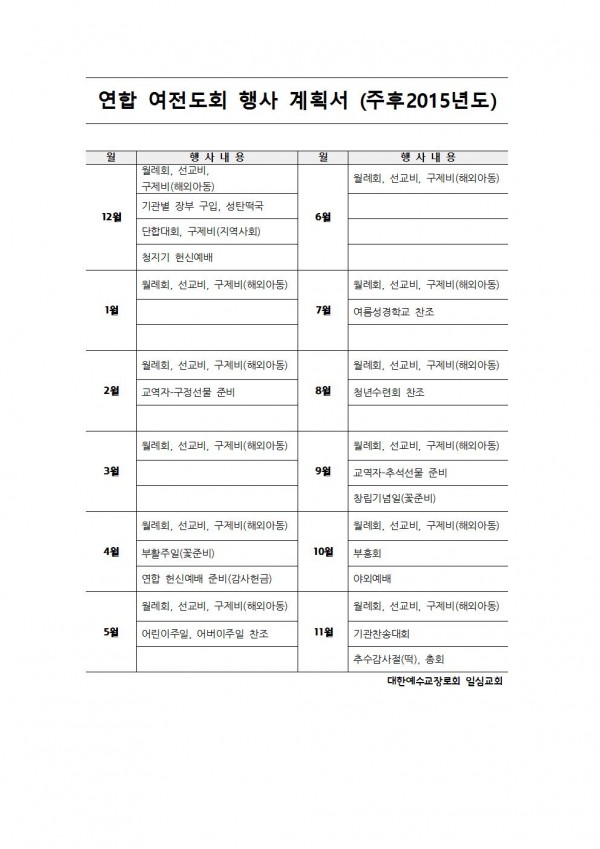 ilsim Contents 일심나눔터 공지사항 경조부 게시판 행사갤러리 새가족소개 섬김부서 유아부 유치부 유년부 초등부 학생부 청년부 남전도회 여전도회 예배설교 목사님설교 초청강사설교 특별영상 찬양 교회소개 교회비전 예배안내 섬기는이들 교회발자취 오시는길 여전도회 여전도회 > 섬김부서 > Home 여전도회 연합여전도회 연간계획_2015 페이지 정보 작성자 관리자 작성일15-11-06 15:18 조회8,026회 댓글0건 이전글 목록 본문 연간계획안 댓글목록 등록된 댓글이 없습니다. 이전글 목록